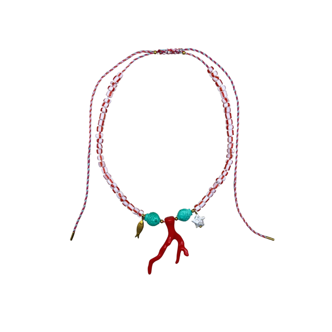 Breng een vleugje zomer in je look met deze opvallende ketting in rood en roze. De ketting is voorzien van een koraalvormige hanger en een speels, kustgeïnspireerd touwdesign. Perfect als statement piece voor zonnige dagen – stijlvol, ontspannen en onmisbaar in je zomergarderobe.