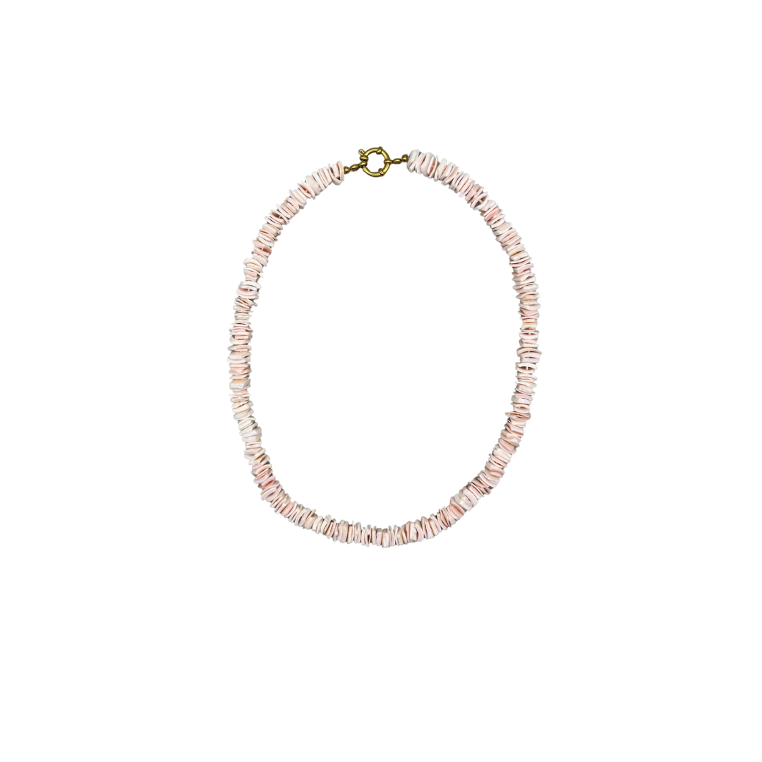 Deze ketting is ontworpen om een vleugje organische charme aan je dagelijkse look toe te voegen. Met prachtige roze schelpen met een zachte, delicate tint en een verbluffende natuurlijke textuur is dit het perfecte sieraad voor een dromerige, verfijnde uitstraling.